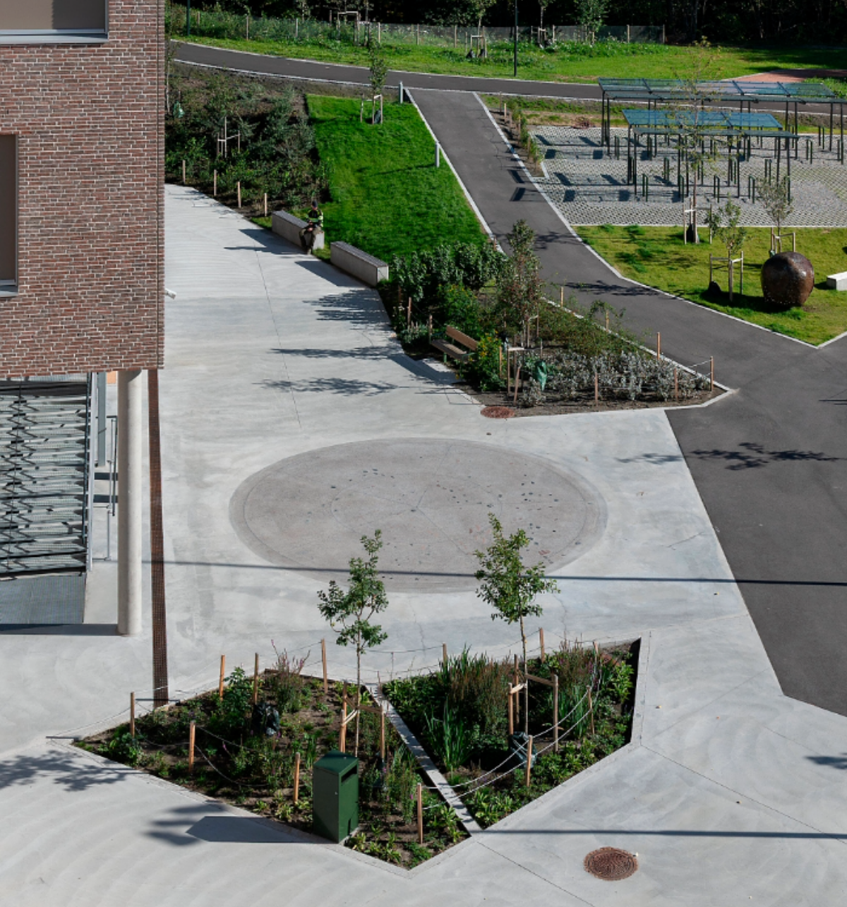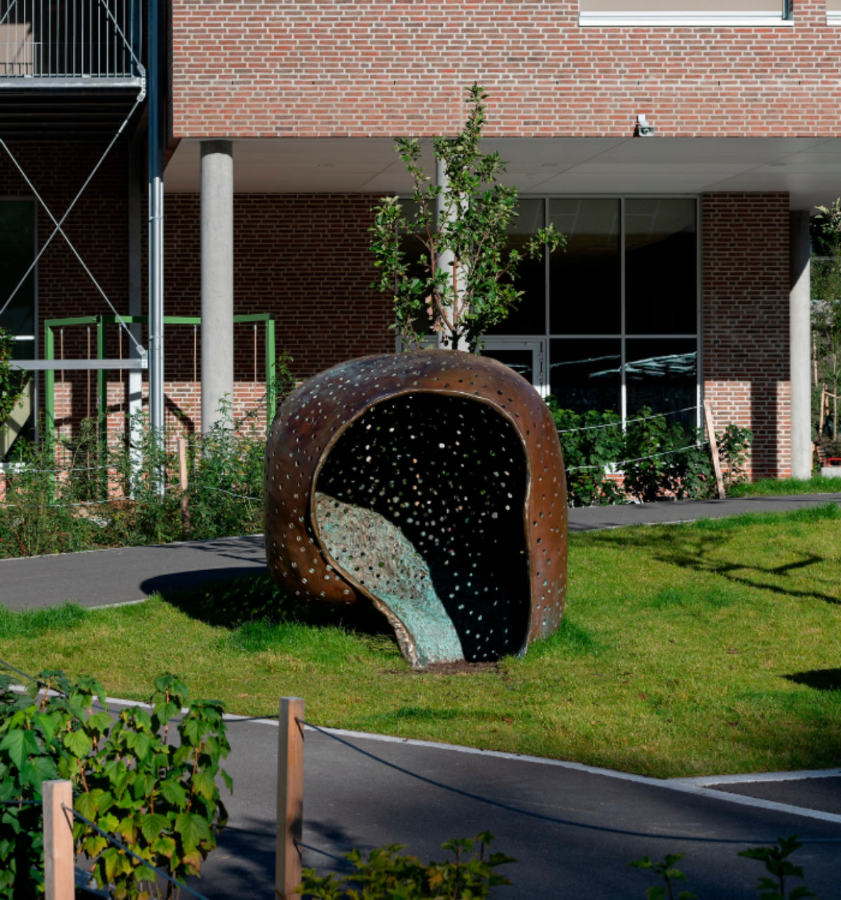 Verket har fått en naturlig, organisk plass på skolens nedre grøntområde som grenser til gangveiene langs Akerselva.