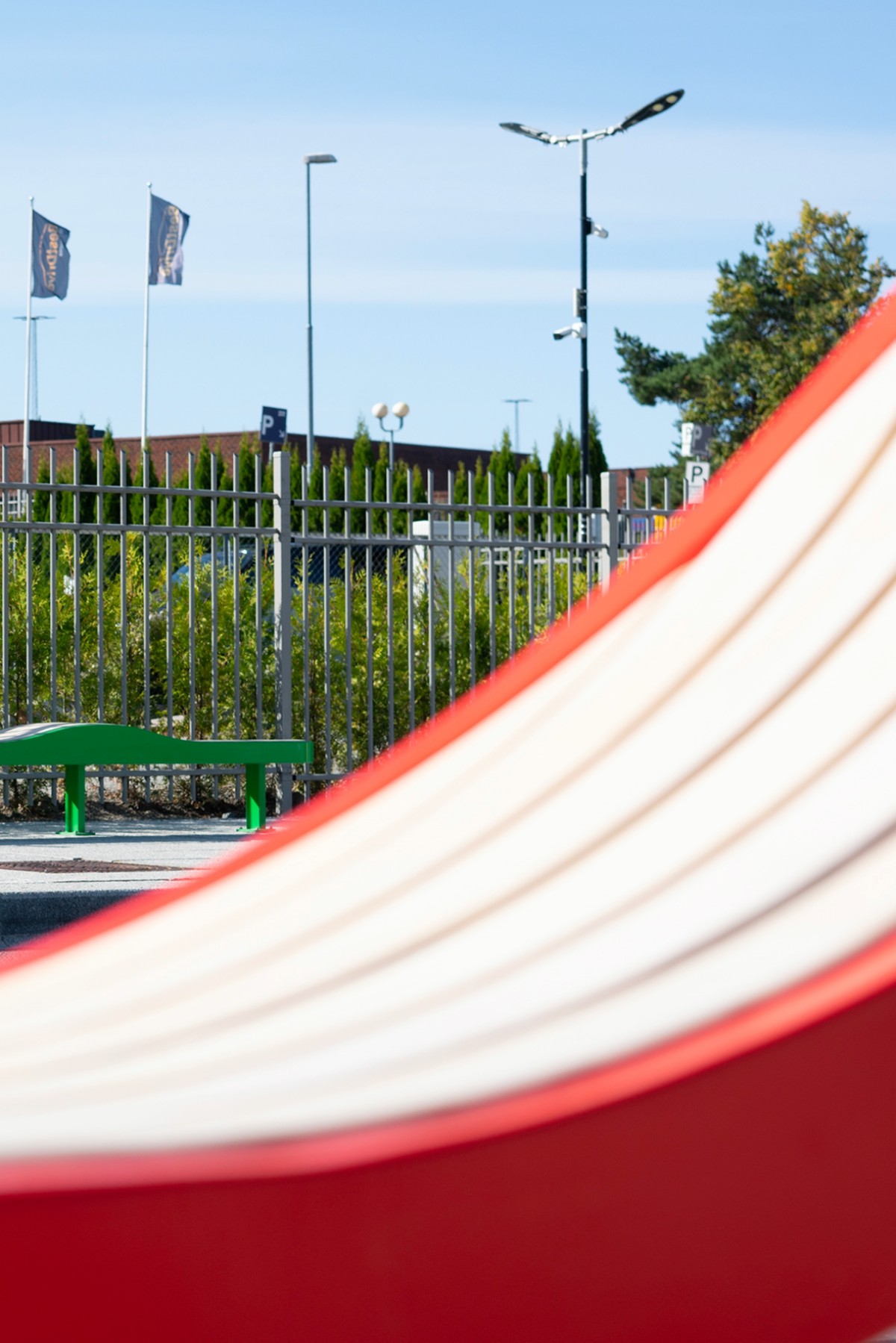 Til regnbedet lager Hasan et landemerke: en høyreist skulptur som er en forstørrelse av kjelkens ben. Fargevalget i rød, gul og grønn minner om en ikonisk trikolor og identitetsmarkør for en folkekjær forestilling om nordmannen på ski i påskefjellet.