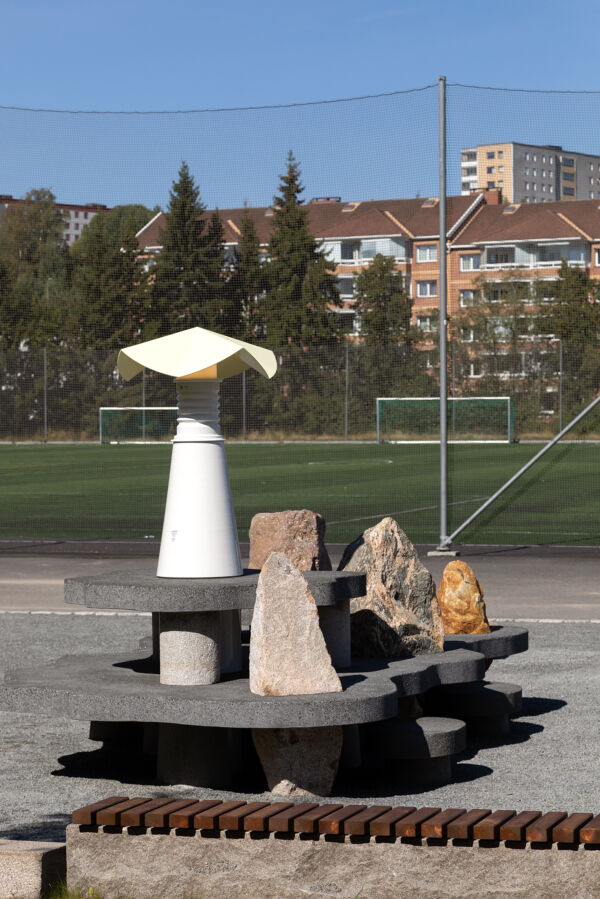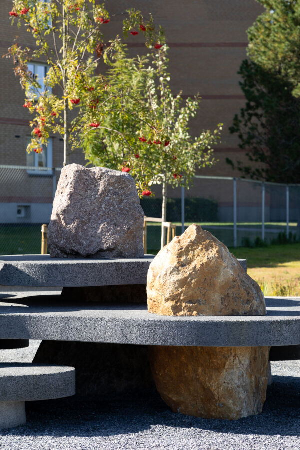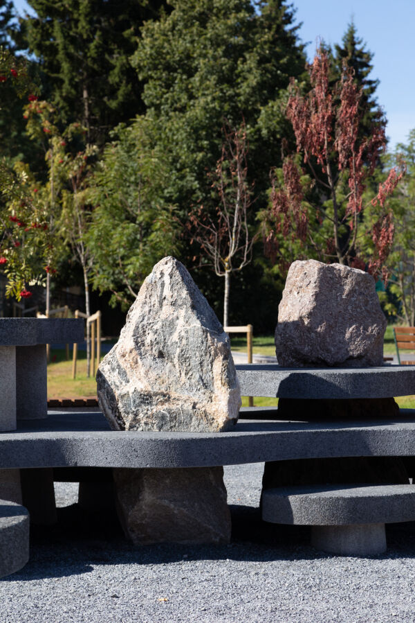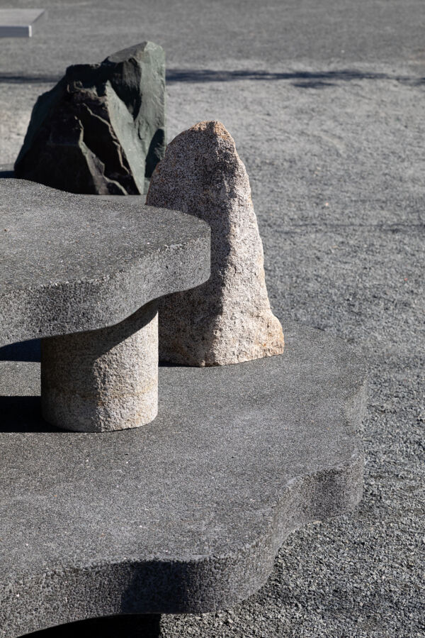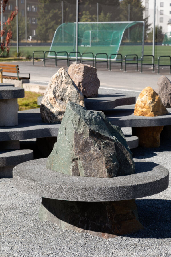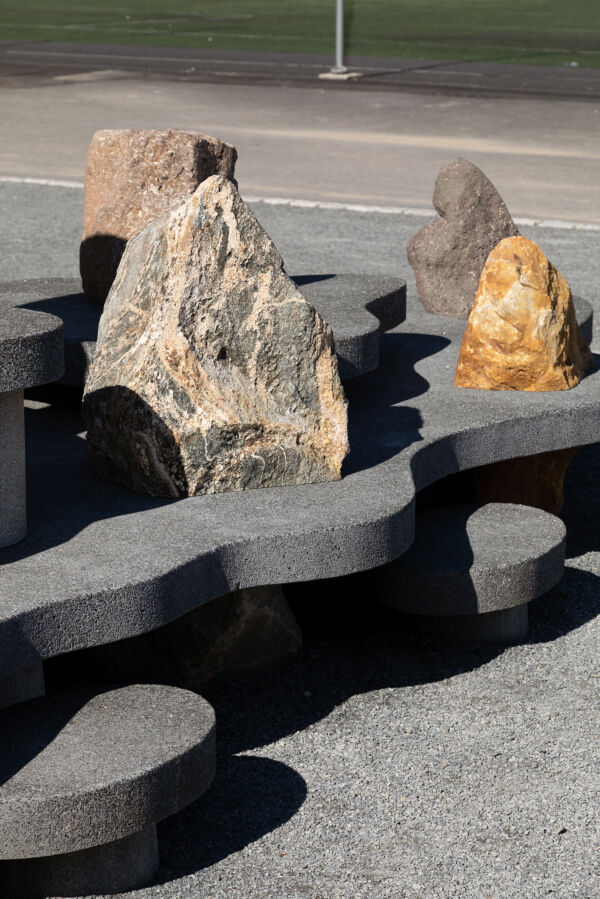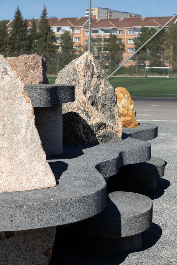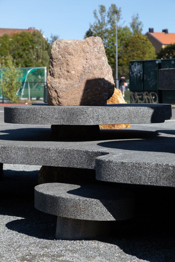 Mokkelbost har utformet et verk hvor estetikk og funksjon møtes i form av en sitteskulptur. En komposisjon av separate elementer i stein, betong og glasert keramikk utgjør skulpturen som består av en rekke plan i gradvise trinn, som sammen danner et abstrakt landskap i miniatyr - en slags tredimensjonal collage. Mokkelbost er kjent for sitt arbeid med nettopp collage, og sin teft for å skape sammenhenger mellom kontrasterende elementer.