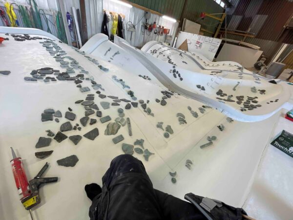 Teppet ser ut til å ha brålandet i en frosset bevegelse midt på Skoletorget, mellom byggenes innganger, og med god utsikt utover det fallende landskapet. Klar til å ta av for reisen videre.